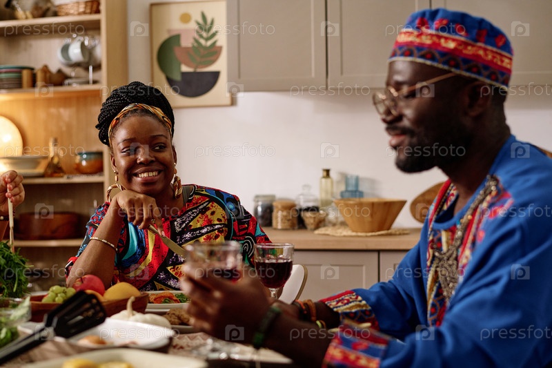 Счастливая афроамериканская женщина в этнической одежде смотрит на своего мужа