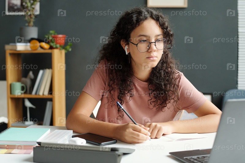Серьезный ученик средней школы смотрит на экран ноутбука и делает заметки