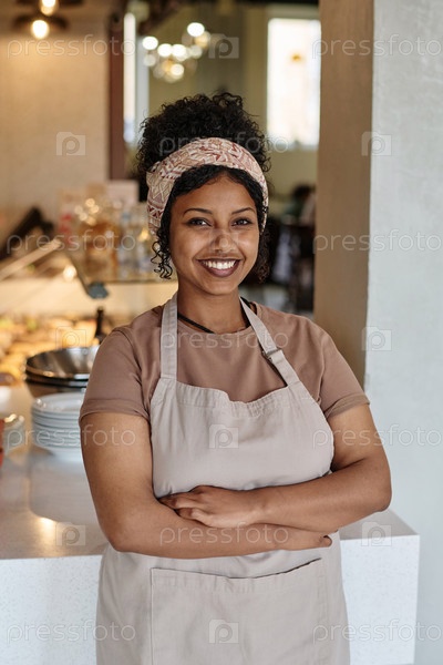 Молодая сотрудница стоит на своем рабочем месте в кафетерии