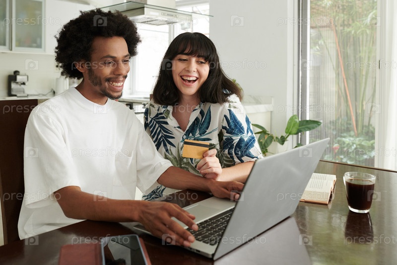 Милая брюнетка с кредитной картой и ее парень смотрят на экран ноутбука