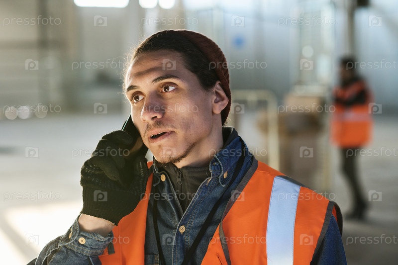 Молодой уверенный мужчина-инженер в рабочей одежде, разговаривающий по мобильному телефону