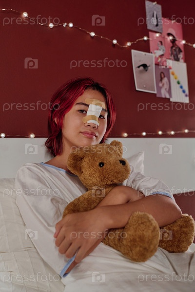 Милая девочка-подросток с повязкой на носу, которая держит коричневого медведя