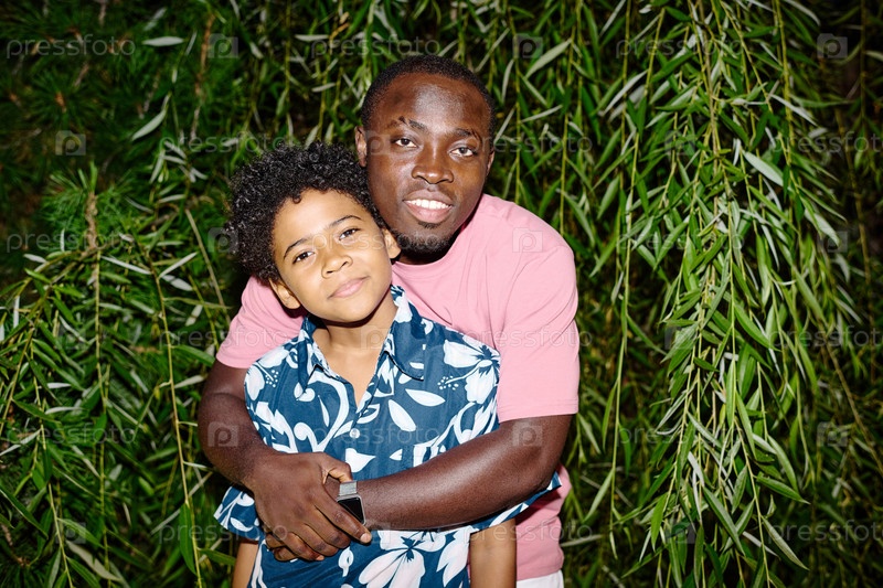 Молодой улыбающийся мужчина обнимает своего милого сына в гавайской рубашке