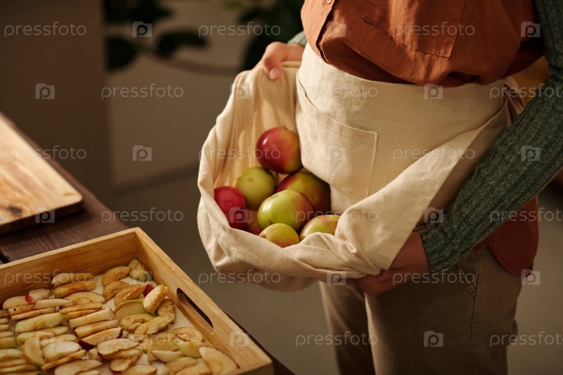 Нижняя часть молодой девушки, несущей кучу свежеспелых садовых яблок в фартуке