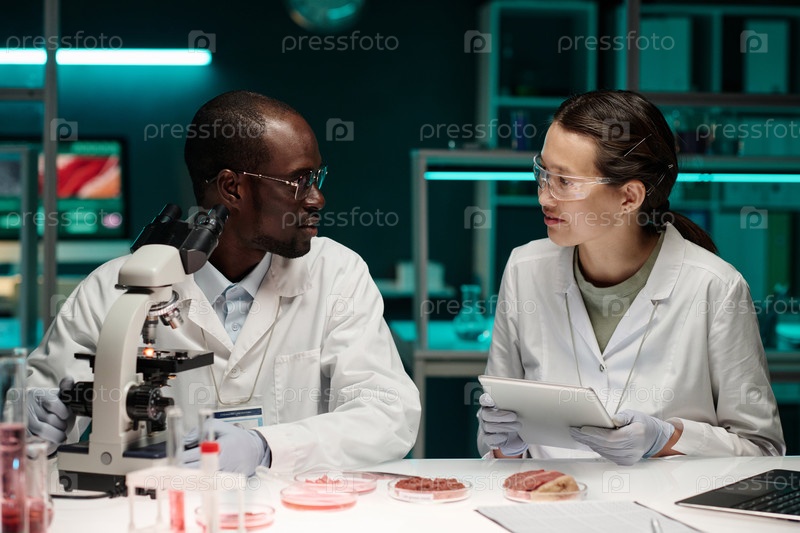 Два бирациальных исследователя сидят в лаборатории и обсуждают синтетическое мясо