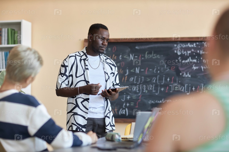 Афроамериканский парень с планшетом слушает одного из одноклассников на семинаре