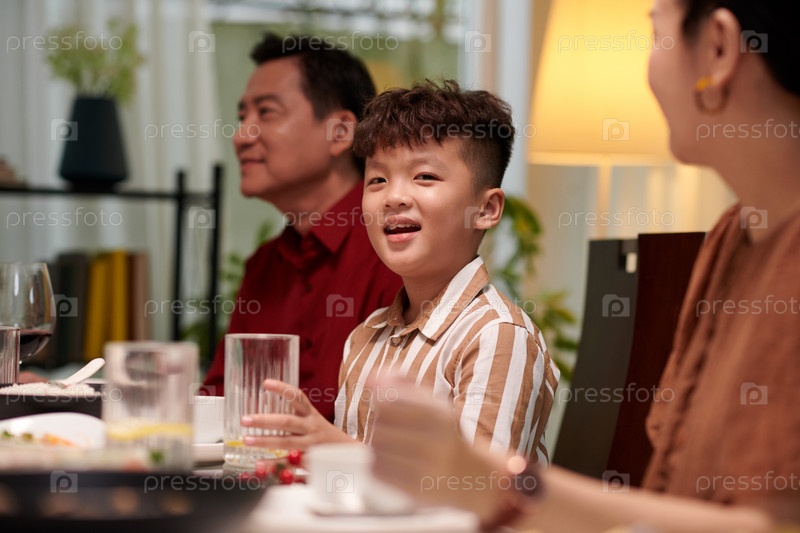 Веселый мальчик наслаждается ужином