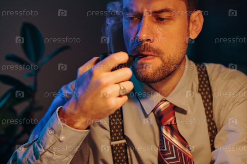 Молодой задумчивый бизнесмен с курящей трубой во рту