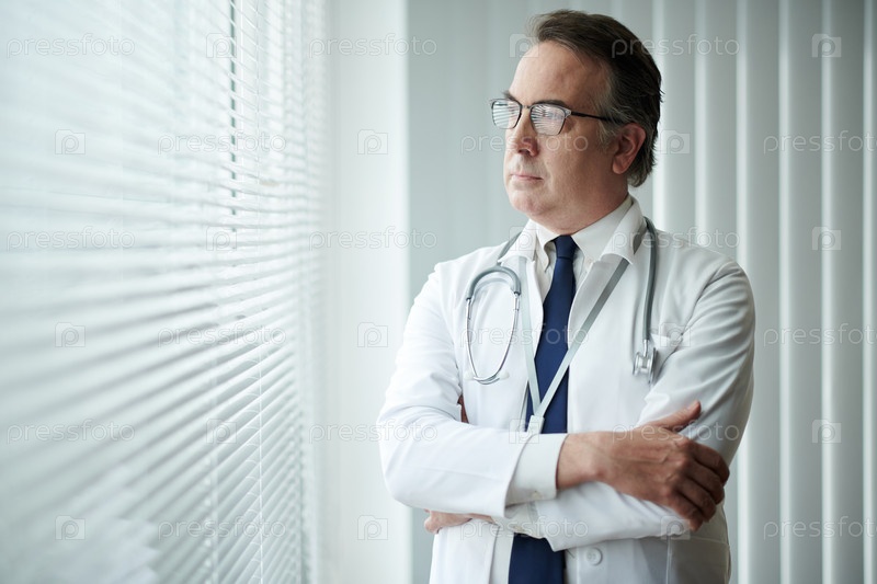 Пенсивный врач, стоящий у окна