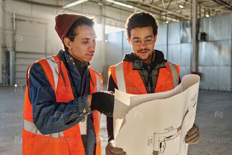 Два молодых мультиэтнических инженера смотрят на строительный план по чертежу