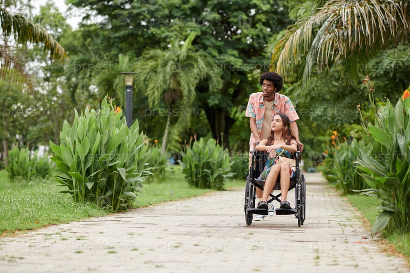 Мужчина толкает инвалидное кресло своей девушки