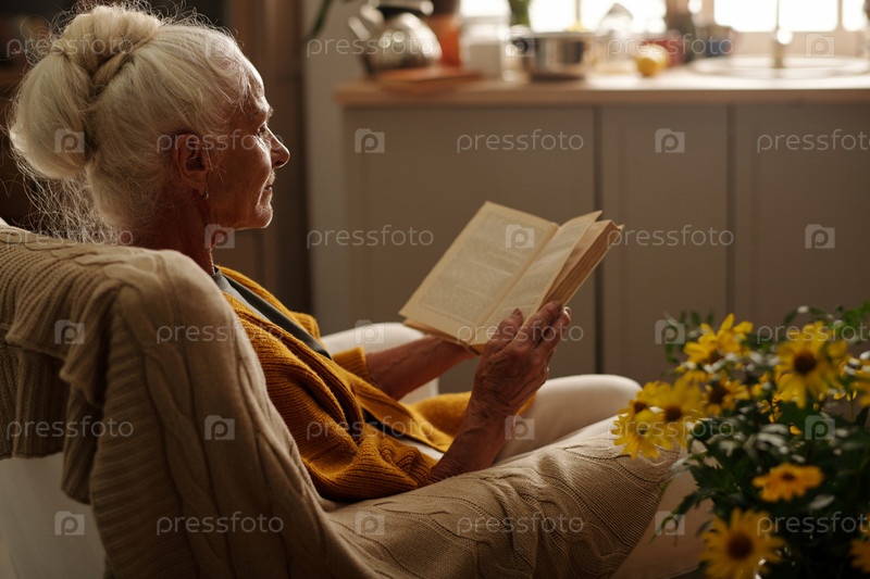 Боковой вид пожилой женщины с белыми волосами, читающей книгу в загородном доме