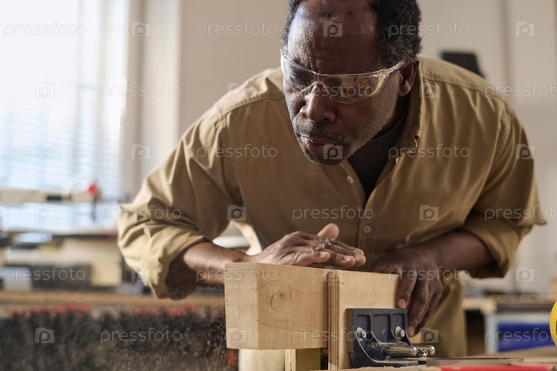 Старший чернокожий мужчина в качестве плотника тщательно чистит пиломатериалы для строительной мебели
