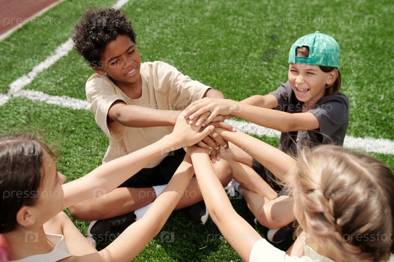 Куча рук четырех юных школьных друзей и футболистов