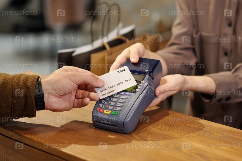 Рука неузнаваемого мужского потребителя, держащего кредитную карту на экране терминала