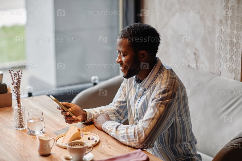 Молодой улыбающийся бизнесмен смотрит на кого-то на экране смартфона