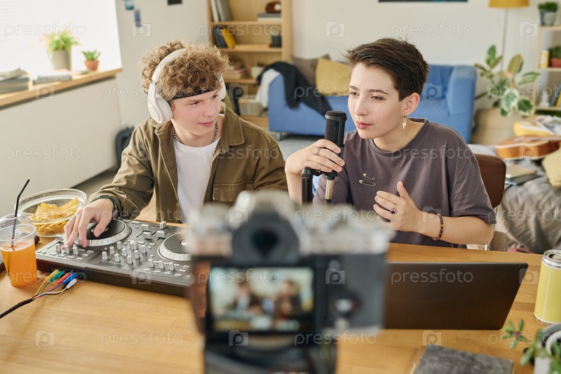 Милая брюнетка поет или говорит в микрофоне перед ноутбуком