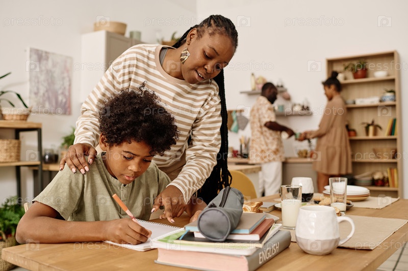 Контролирование сына, выполняющего домашнее задание дома