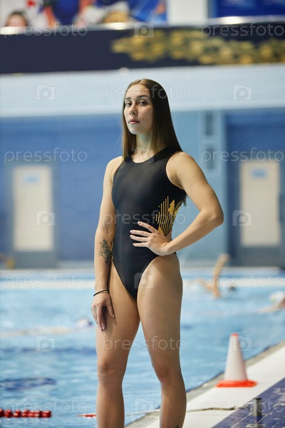 Молодая спортсменка в купальнике стоит у бассейна на стадионе