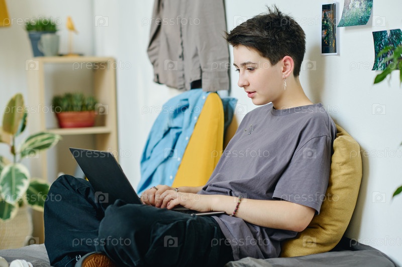 Красивый подросток в повседневной одежде печатает на клавиатуре ноутбука и смотрит на экран