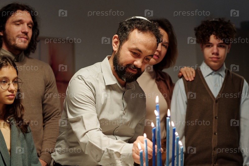Зрелый мужчина с еврейской шапочкой ставит горящую синюю свечу на подсвечнике