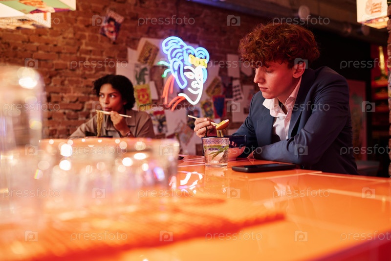 Сосредоточьтесь на молодом бизнесмене, получающем японскую еду в кафе или ресторане
