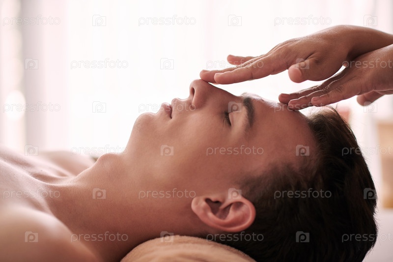 Вид на молодого спокойного и расслабленного мужчину, наслаждающегося массажем лица
