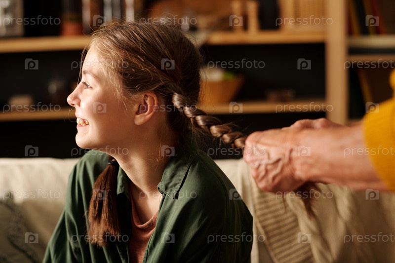 Счастливая девочка сидит перед камерой, пока бабушка плетет свои косы