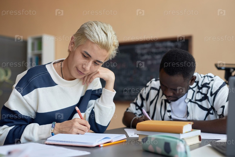 Молодой азиат с окрашенными блондинками смотрит на вопросы теста