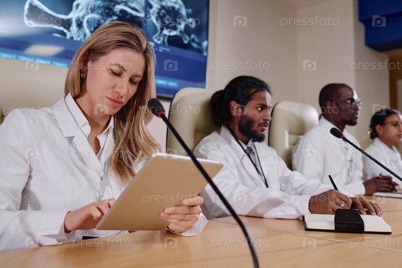 Женщина, использующая планшетный компьютер на конференции