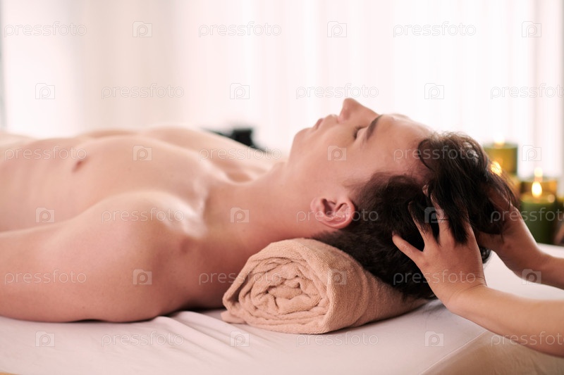 Боковой вид молодого мужского клиента профессионального спа-салона, наслаждающегося массажем