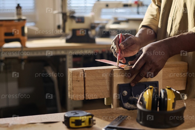 Старший плотник измеряет древесину и строительную мебель в мастерской