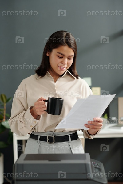 Счастливая молодая бизнесвумен с финансовыми документами и чашечкой кофе