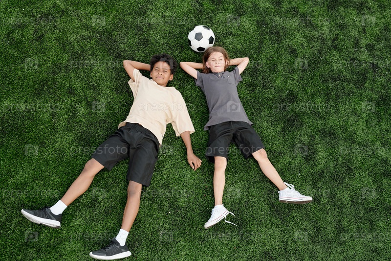 Высокий угол двух расслабленных межкультурных мальчиков в спортивной одежде, лежащих на лужайке