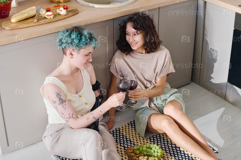Счастливая молодая брюнетка и ее девушка-инвалид с вином