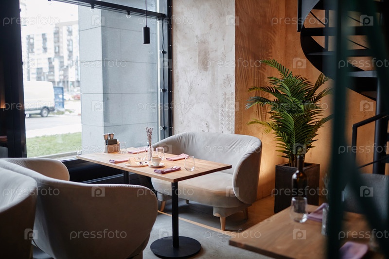 Интерьер уютного кафе или ресторана с серыми бархатными диванами и деревянными столами