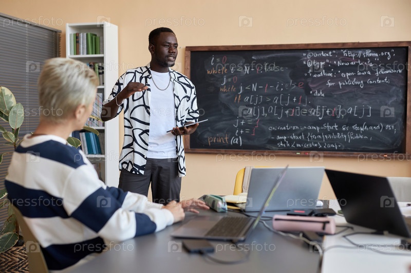 Уверенный в себе афроамериканский студент-мужчина с планшетом, стоящий у доски