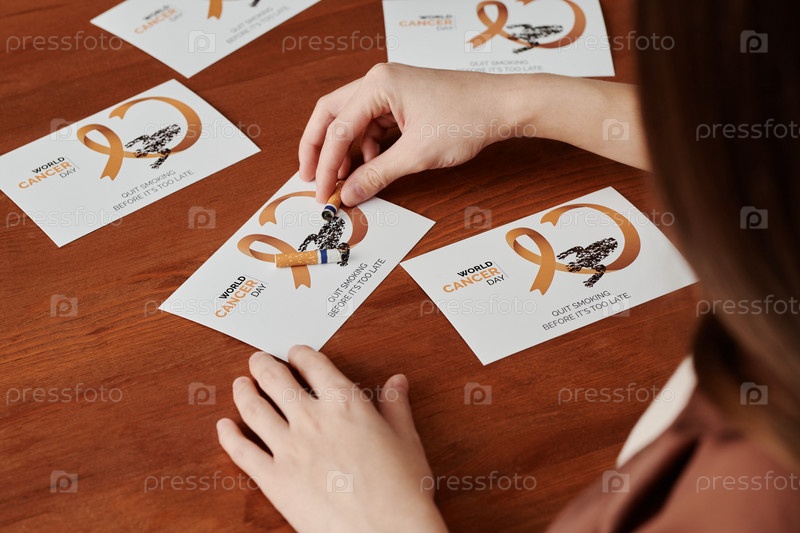 Рука девушки, рисующей сигаретные задницы на открытке с символом рака легких