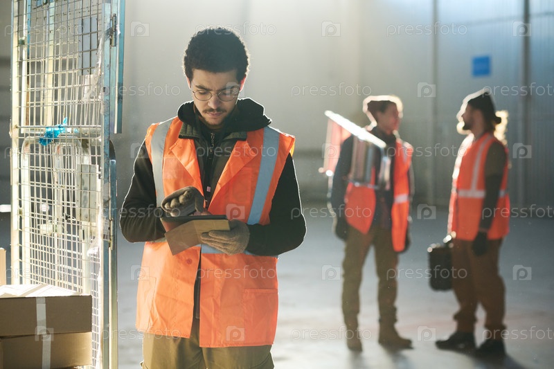 Молодой серьезный инженер в рабочей одежде прокручивает планшет на складе