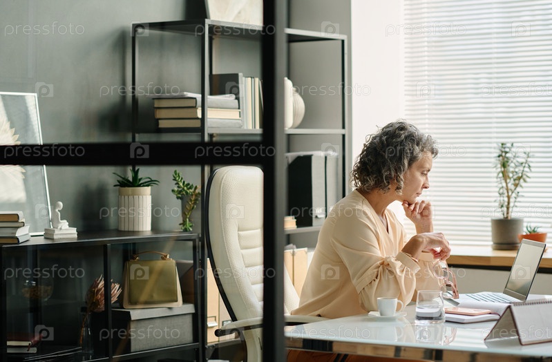 Боковой вид серьезной женщины-аналитика, просматривающей информацию в Интернете