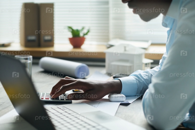 Рука молодого архитектора-мужчины, нажимающего кнопки калькулятора по рабочим местам