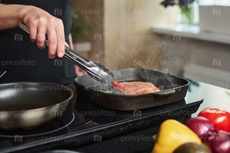 Человек, который ставит чили-перец рядом с жареным стейком