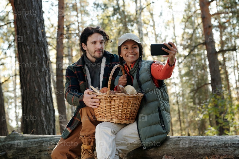 Двое счастливых молодых собирателей грибов в повседневной одежде делают селфи