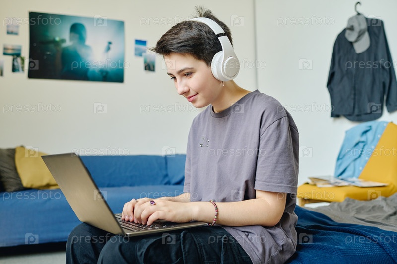 Брюнетка-подросток в наушниках и повседневной одежде, печатающая на клавиатуре ноутбука
