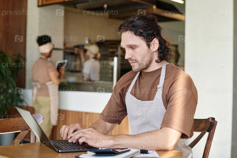 Владелец пекарни делает бизнес-план на своем персональном компьютере