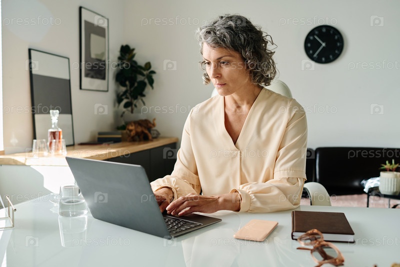 Серьезный зрелый директор компании смотрит на экран ноутбука