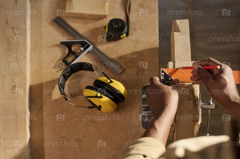 Top View Плотник, измеряющий дерево и строительную мебель