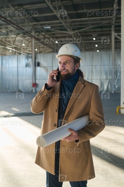 Молодой бородатый инженер со смартфоном и свернутым чертежом