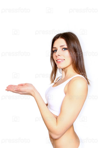 Улыбающаяся девушка показывают что-то, изолированная на белом фоне