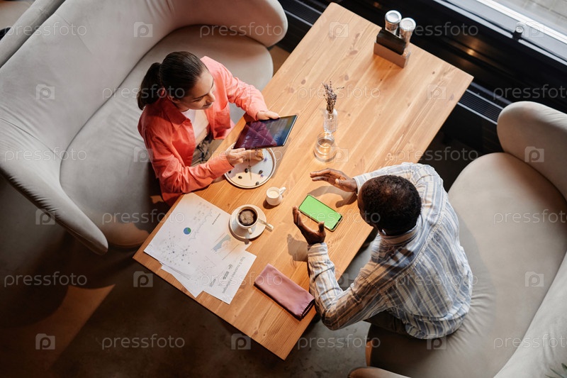 Верхний угол двух молодых межкультурных экономистов, ведущих дискуссию